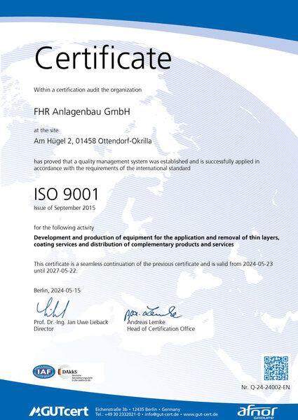 在 FHR Anlagenbau GmbH,我们为确保生产和人员结构的最高标准和质量而感到自豪。在此,我们向您介绍我们所获得的认证和质量证书,它们彰显了我们对优化和可持续发展的承诺。